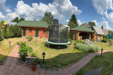 На участке все дорожки выложены плитками7, волейбольная площадка, детский батут, дартс, место под настольный тенис.