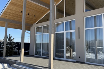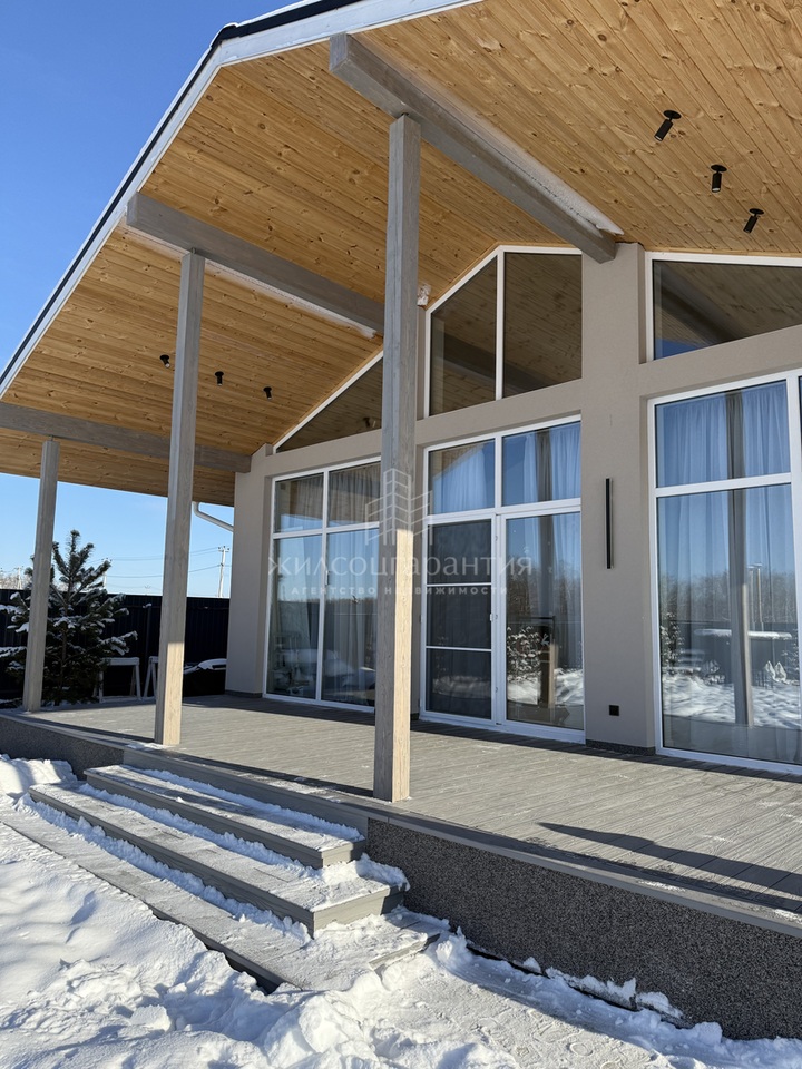 Планировка удобная, гостиная с панорамными окнами и высотой потолка 5.4 м в самом высоком месте, площадь гостиной 37 кв.м, с выходом на террасу 30 кв м, 3 отдельные комнаты, одна из комнат мастер-спальня, со своим санузлом 16 кв м, спальни 14 и 10 кв м, 2 санузла.
