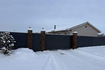 Участок 10 соток правильной формы, огорожен забором из профнастила, автоматические откатные ворота, видеонаблюдение по периметру, высажены 20 елок по периметру, также освещение по всему периметру.